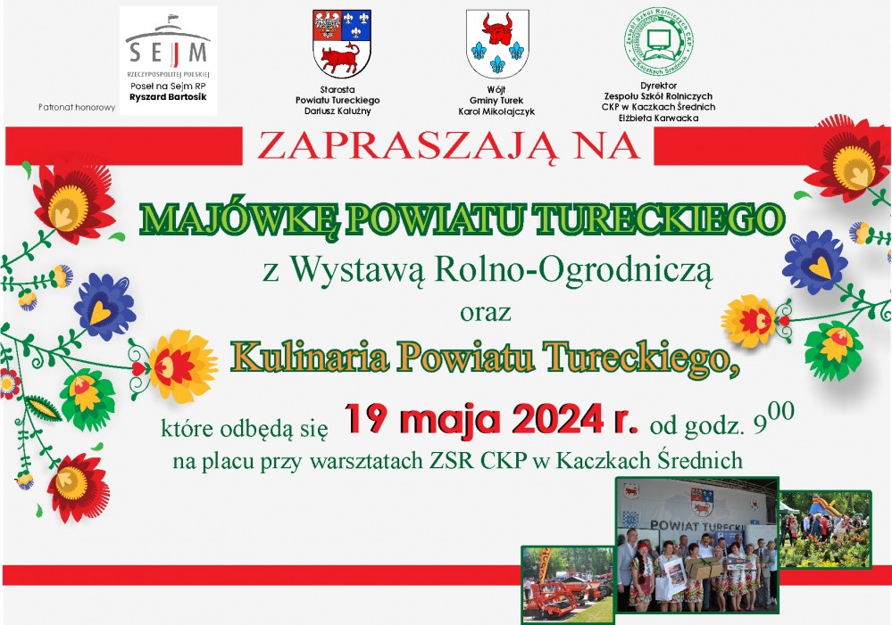 PROGRAM MAJÓWKI POWIATU TURECKIEGO: 9.00 - otwarcie Majówki Powiatu Tureckiego 10.00 - występy artystyczne 11.00 - gotowanie na scenie „Gotować każdy może❞ 12.00- występy artystyczne 12.30 - gotowanie na scenie,,Gotować każdy może❞ 13.00 - rozstrzygnięcie konkursu na,,Najpiękniejsze EKO stoisko KGW" 13.30- występy artystyczne 13.50 -,,Gotować każdy może" - ogłoszenie zwycięzcy i wręczenie nagród 14.15 - rozstrzygnięcie konkursu VI Kulinaria Powiatu Tureckiego 15.15 - występy artystyczne ponadto: stoiska wystawiennicze (ogrodnictwo, rolnictwo, pszczelarstwo, itp.) atrakcje dla dzieci prezentacje nowych technologii degustacje potraw kulinarnych...