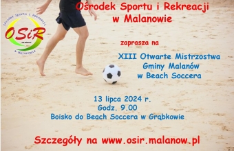 Ośrodek Sportu i Rekreacji w Malanowie zaprasza wszystkich sympatyków piłki nożnej plażowej do wzięcia udziału w XIII Otwartych Mistrzostwach Gminy Malanów w Beach Soccera. Turniej odbędzie się w sobotę 13 lipca 2024 r. na boisku do piłki nożnej plażowej w Grąbkowie obok sali OSP.Rozpoczęcie zawodów o godz. 9:00. Do rywalizacji mogą przystąpić zespoły składające się min. z 5, a maks. z 10 zawodników.Zgłoszenia przyjmowane są do 12 lipca 2024 r. do godz. 12:00: - w siedzibie OSiR w Malanowie ul. Parkowa 29 (I piętro sali sportowej), - przez e-mail sport@malanow.pl Szczegółowe informacje dostępne pod nr. tel. 63 278 05 30 oraz w Regulaminie załączonym poniżej. ŁJ...