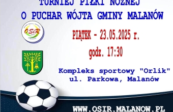 Ośrodek Sportu i Rekreacji w Malanowie zaprasza wszystkie chętne drużyny do udziału w Turnieju Piłki Nożnej o Puchar Wójta Gminy Malanów 2025 Turniej odbędzie się 23 maja 2025 r. (piątek) o godz. 17:30 na obiekcie sportowym ORLIK przy ul. Parkowej 29 w Malanowie. Zgłoszenia przyjmowane są do 22 maja 2025 r. do godz. 15.00 Zapisy przyjmowane są:- w biurze OSiR Malanów przy ul. Parkowej 29 w Malanowie (I piętro Sali sportowej) - poprzez e-mail: sport@malanow.pl PG...