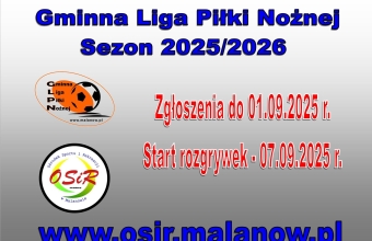 Startuje nowy sezon Gminnej Ligi Piłki Nożnej w Malanowie Poniżej do pobrania aktualny Regulamin GLPN na sezon 2025/2026, wzór listy zgłoszeniowej, oświadczenia o stanie zdrowia (dla zawodników pełnoletnich) oraz zgoda rodziców na udział w rozgrywkach dla zawodników poniżej 18 roku życia. Termin składania list zgłoszeniowych - 01.09.2025 r.Planowany początek rozgrywek 07.09.2025 r.Listy zgłoszeniowe można składać osobiście w biurze OSiR w Malanowie (sala sportowa przy ul. Parkowej 29) lub elektronicznie przez e-mail sport@malanow.pl. Terminarz rozgrywek zostanie opublikowany po zakończeniu zgłoszeń. MK...