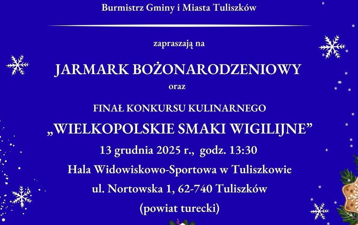 Samorząd Województwa Wielkopolskiego zaprasza Koła Gospodyń Wiejskich z województwa wielkopolskiego do udziału w konkursie na świąteczną potrawę pn. „Wielkopolskie Smaki Wigilijne”. Do wygrania nagrody! UWAGA!!!! Zmiana miejsca organizacji konkursu oraz jarmarku Finał Konkursu odbędzie się w dniu 13 grudnia 2025 r. w Hali Sportowej przy ul. Nortowskiej 1, w Tuliszkowie (gmina Tuliszków, powiat turecki, województwo wielkopolskie) podczas Jarmarku Bożonarodzeniowego Zasady uczestnictwa Konkurs odbędzie się w dwóch kategoriach: na potrawę wytrawną na potrawę słodką KGW chętne do udziału w konkursie prosimy o przesłanie Karty zgłoszeniowej do Konkursu (załącznik nr 1) wraz z podpisaną klauzulą informacyjną...