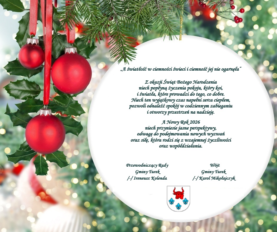 Z okazji Świąt Bożego Narodzenia niech popłyną życzenia pokoju, który koi, i światła, które prowadzi do tego, co dobre. Niech ten wyjątkowy czas napełni serca ciepłem, pozwoli odnaleźć spokój w codziennym zabieganiu i otworzy przestrzeń na nadzieję. A Nowy Rok 2026 niech przyniesie jasne perspektywy, odwagę do podejmowania nowych wyzwań oraz siłę, która rodzi się z wzajemnej życzliwości oraz współdziałania. ...