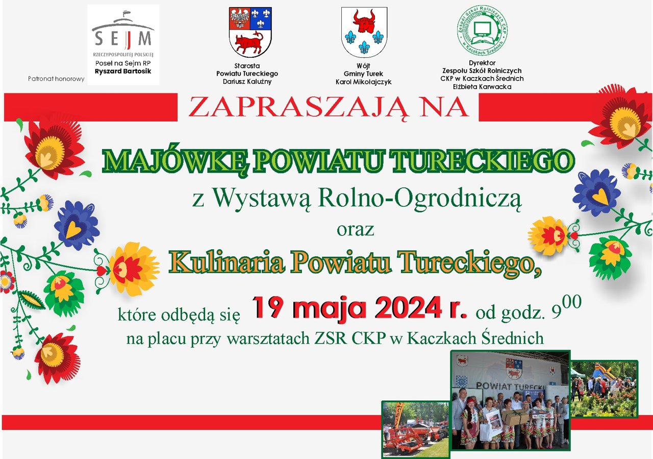 Serdecznie zapraszamy do udziału w Majówce Powiatu Tureckiego 9.00 - otwarcie Majówki Powiatu Tureckiego10.00 - występy artystyczne11.00 - gotowanie na scenie „Gotować każdy może❞12.00- występy artystyczne12.30 - gotowanie na scenie,,Gotować każdy może❞13.00 - rozstrzygnięcie konkursu na,,Najpiękniejsze EKO stoisko KGW"13.30- występy artystyczne13.50 -,,Gotować każdy może" - ogłoszenie zwycięzcy i wręczenie nagród14.15 - rozstrzygnięcie konkursu VI Kulinaria Powiatu Tureckiego15.15 - występy artystyczne ponadto: stoiska wystawiennicze (ogrodnictwo, rolnictwo, pszczelarstwo, itp.) atrakcje dla dzieci prezentacje nowych technologii degustacje potraw kulinarnych...