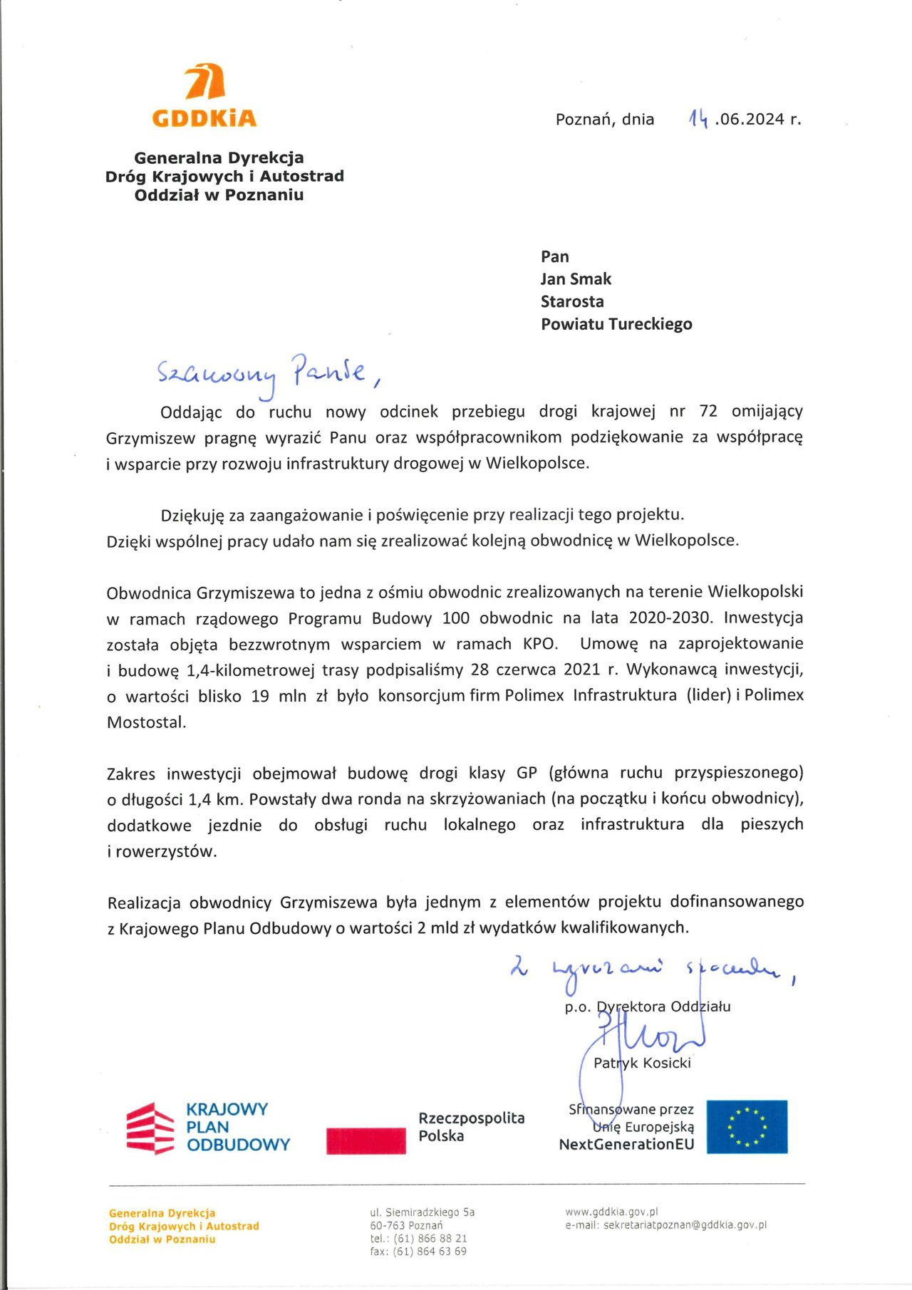 Starosta Turecki Jan Smak oraz pracownicy Starostwa Powiatowego w Turku otrzymali podziękowania od Generalnej Dyrekcji Dróg i Autostrad Oddział w Poznaniu za zaangażowanie przy realizacji projektu polegającego na budowie obwodnicy Grzymiszewa w ciągu drogi krajowej nr 72. Cieszy fakt, że mieszkańcy Powiatu Tureckiego, w szczególności Grzymiszewa zyskali obwodnicę, a tym samym wzrosto ich bezpieczeństw jak również wzrosta jakość infrastruktury drogowej na odcinku Turek -...