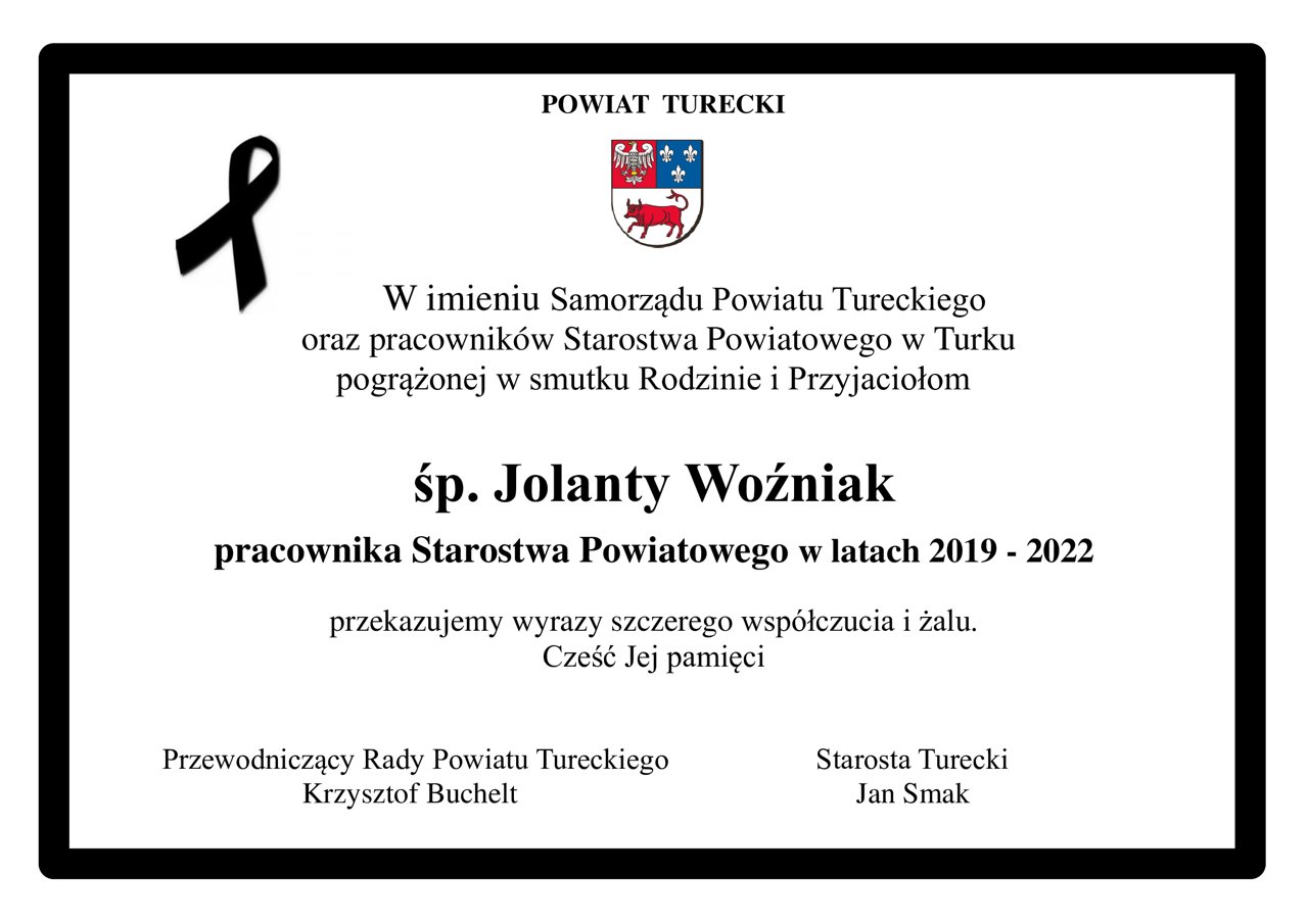 W imieniu Samorządu Powiatu Tureckiego oraz pracowników Starostwa Powiatowego w Turku pogrążonej w smutku Rodzinie i Przyjaciołom śp. Jolanty Woźniak pracownika Starostwa Powiatowego w latach 2019 - 2022 przekazujemy wyrazy szczerego współczucia i żalu. Cześć Jej pamięci Starosta Turecki Jan Smak Przewodniczący Rady Powiatu Tureckiego Krzysztof...