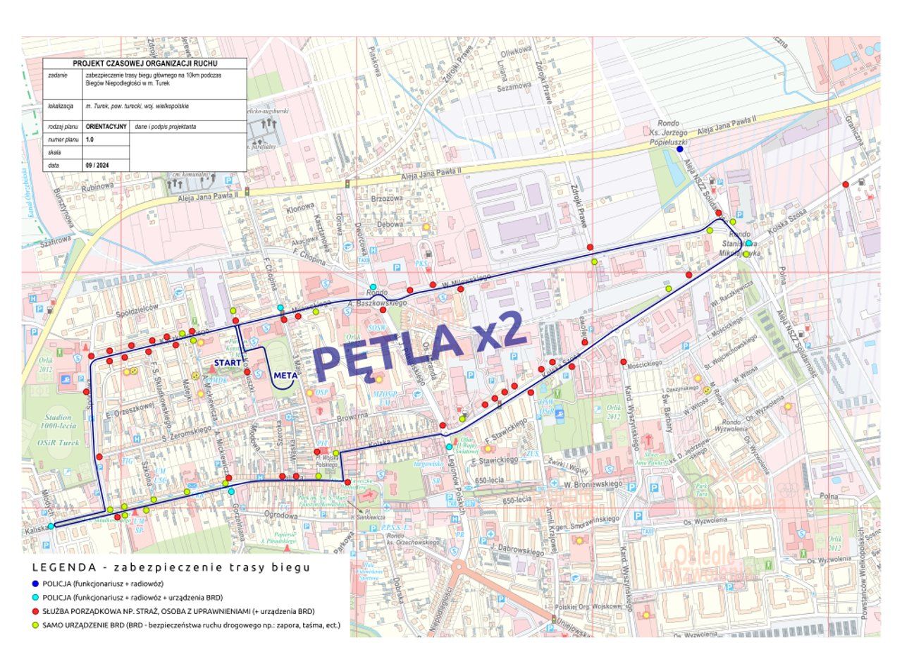 W związku z zaplanowanym biegiem głównym na 10 km – organizowanym w ramach 35. Biegów Niepodległości w godzinach 10.30 – 13.00 na ul. Kościuszki, Kączkowskiego, Sportowej, Kaliskiej, Placu Wojska Polskiego, Kolskiej, Kolskiej Szosy, Milewskiego, Kączkowskiego, Kościuszki wystąpią utrudnienia w ruchu pojazdów. Utrudnienia mogą występować również na ulicach przyległych do wyżej wymienionych. Na czas biegu ruchem kierować będą policjanci oraz strażacy. Prosimy o zachowanie szczególnej ostrożności na odcinkach objętych biegiem oraz stosowanie się do poleceń wydawanych przez służby porządkowe. Za powstałe utrudnienia przepraszamy. ...