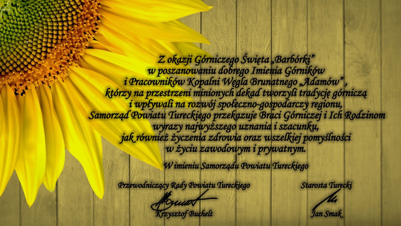 Z okazji Górniczego Święta "Barbórki" w poszanowaniu dobrego Imienia Górników i Pracowników Kopalni Węgla Brunatnego "Adamów", którzy na przestrzeni minionych dekad tworzyli tradycję górniczą i wypływali na rozwój społeczno - gospodarczy regionu, Samorząd Powiatu Tureckiego przekazuje Braci Górniczej i Ich Rodzinom wyrazy najwyższego uznania i szcunku, jak również życzenia zdrowia oraz wszelkiej pomyślności w życiu zawodowym i prywatnym. ...