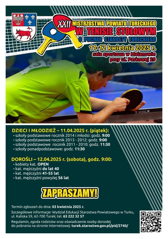 Mamy zaszczyt zaprosić Państwa do udziału w „XXII Mistrzostwach Powiatu Tureckiego w Tenisie Stołowym”. Zawody skierowane będą do wszystkich mieszkańców Powiatu Tureckiego, a ich celem byłaby popularyzacja tenisa stołowego. Najlepsi tenisiści z terenu Państwa gminy wzięliby udział w turnieju finałowym, wyłaniającym mistrza Powiatu Tureckiego w różnych kategoriach wiekowych. W związku z organizacją „XXII Mistrzostw Powiatu Tureckiego w Tenisie Stołowym o Puchar Starosty Tureckiego”, które odbędą się w dniach 11 – 12 kwietnia br. w sali sportowej w Malanowie przy ul. Parkowej 29 przesyłamy harmonogram czasowy zawodów w rozbiciu na kategorie wiekowe: DZIECI I MŁODZIEŻ: 11 kwietnia 2025 r. (piątek) -...