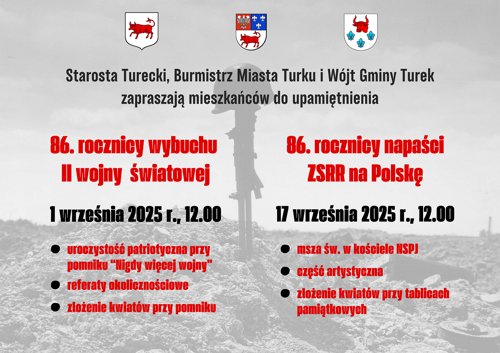 Starosta turecki , Burmistrz Miasta Turku oraz Wójt Gminy Turek zapraszają mieszkańców do wspólnego upamiętnienia dwóch ważnych rocznic związanych z tragicznymi wydarzeniami września 1939 roku. Pierwsze uroczystości odbędą się 1 września o godzinie 12.00 przy pomniku „Nigdy więcej wojny”. W programie przewidziano wystąpienia okolicznościowe oraz złożenie kwiatów, które będą wyrazem pamięci o bohaterach walczących w obronie Ojczyzny i wszystkich ofiarach II wojny światowej. Kolejne spotkanie upamiętniające odbędzie się 17 września, również o godzinie 12.00. Rozpocznie się mszą świętą w kościele Najświętszego Serca Pana Jezusa, po której zaplanowano część artystyczną oraz złożenie...
